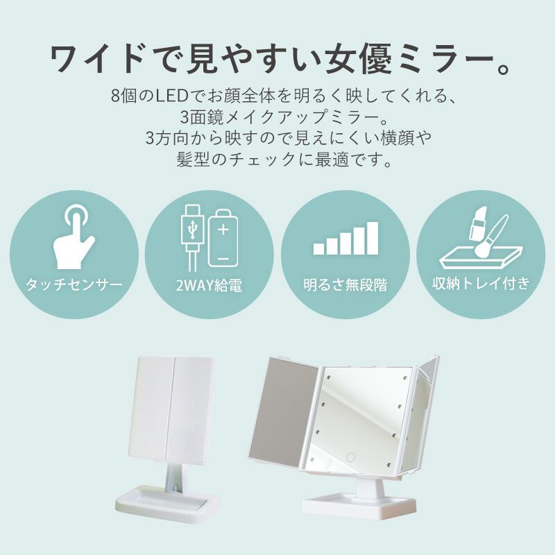 [8灯] LEDライト付き 三面鏡卓上ミラー 8灯 三面鏡 タッチパネル おしゃれ 折りたたみ式 明るさ調節 角度調節 シンプル コンパクト USB充電 2301