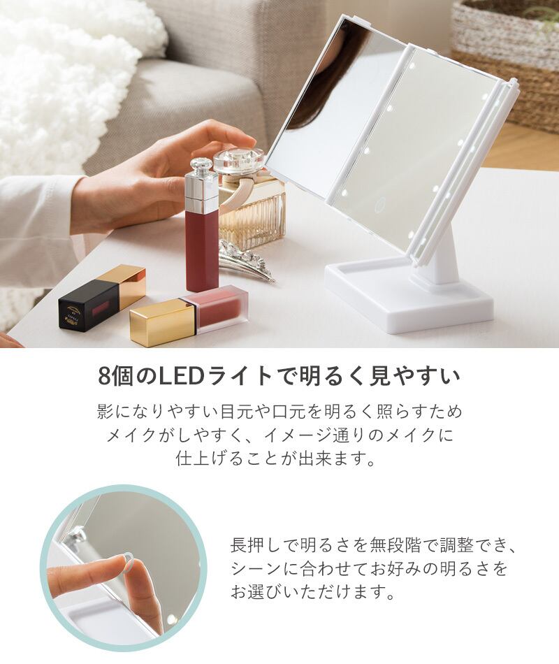 8個のLEDライトが、お顔全体を明るく照らしてくれる3面鏡タイプのメイクアップミラー。 3方向から映せるため、見えにくい横顔や髪型のチェックも簡単で、細かい部分の確認にも最適です。 機能性と便利さを兼ね備えたデザインで、日々のメイクやスタイリングを快適にサポートします。