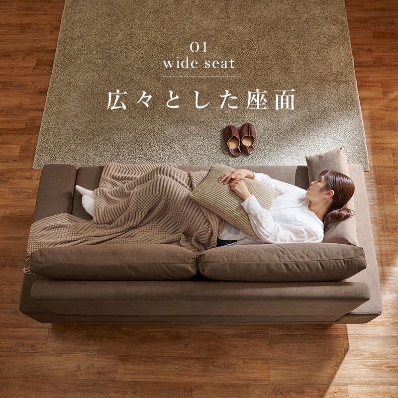 低めのフラット肘、ゆったりと広い座面で寝転んでくつろげるソファ。ロー/ハイ兼用