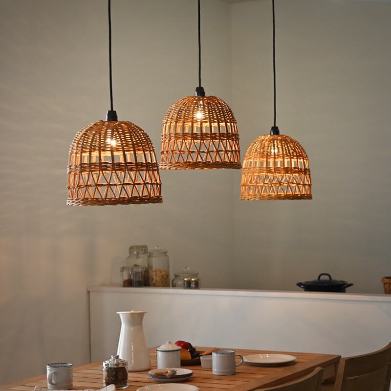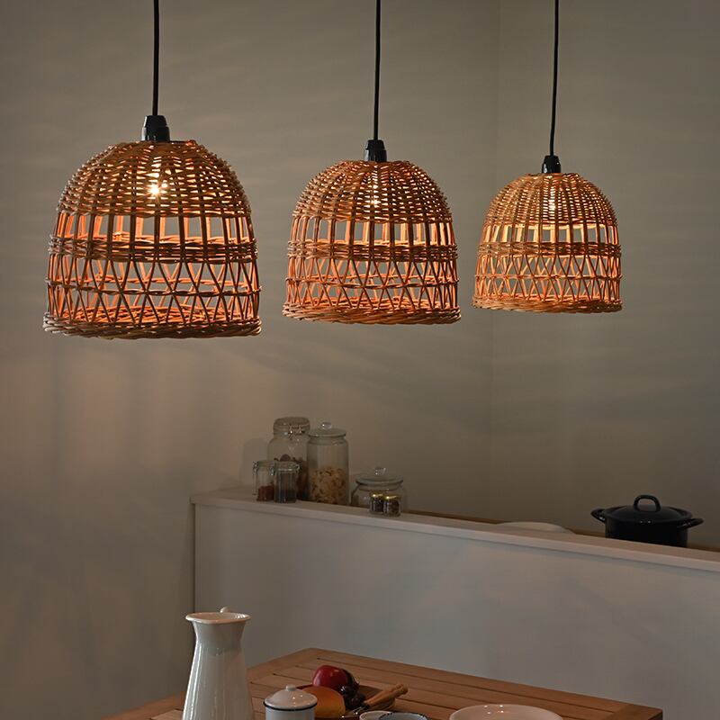 天然素材のラタンで作られたランプシェードは、編み目が通気性を確保し、光を柔らかく拡散させるため、優しい明かりを楽しむことができます。