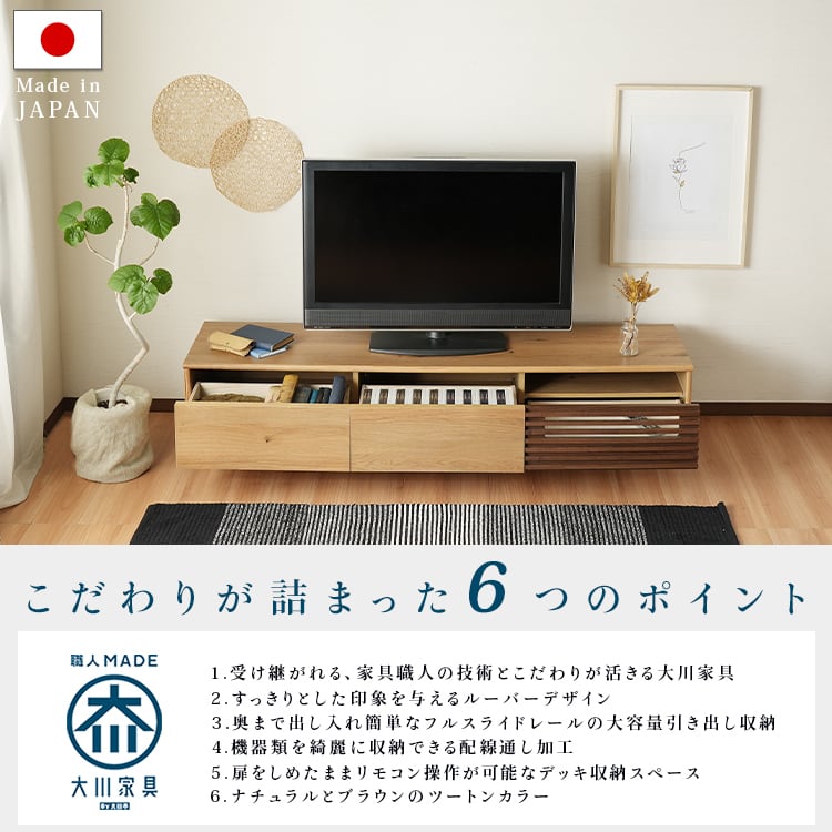 どんなインテリアにも馴染むナチュラルな木目に、アクセントとしてあしらわれたブラウンのルーバー(格子)デザインが特徴的なテレビボードです。