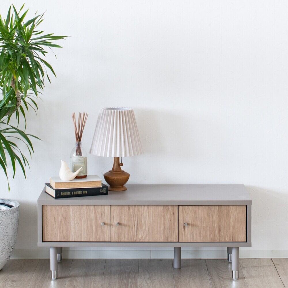 ツートーンカラーの本体×アクセントにシルバー色を加えたデザインが魅力です。トレンドのグレー色にナチュラルな木目色を組み合わせる事で、様々なインテリアに合わせやすいスタイルとしました。奥行を浅くしたサイズ感で、お部屋を広く使えます。キャビネットと組み合わせて、テレビまわりの収納を拡張するのもおすすめです。