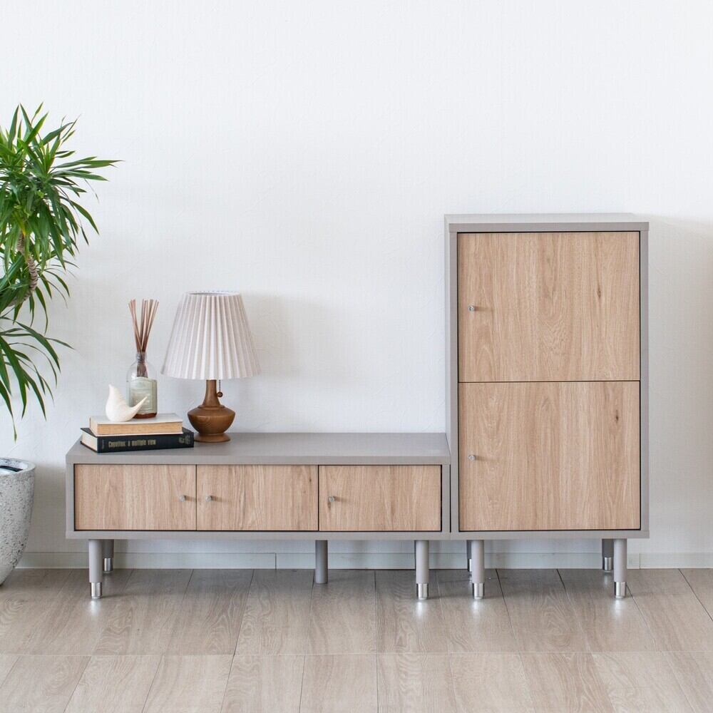 ツートーンカラーの本体×アクセントにシルバー色を加えたデザインが魅力です。トレンドのグレー色にナチュラルな木目色を組み合わせる事で、様々なインテリアに合わせやすいスタイルとしました。奥行を浅くしたサイズ感で、お部屋を広く使えます。キャビネットと組み合わせて、テレビまわりの収納を拡張するのもおすすめです。
