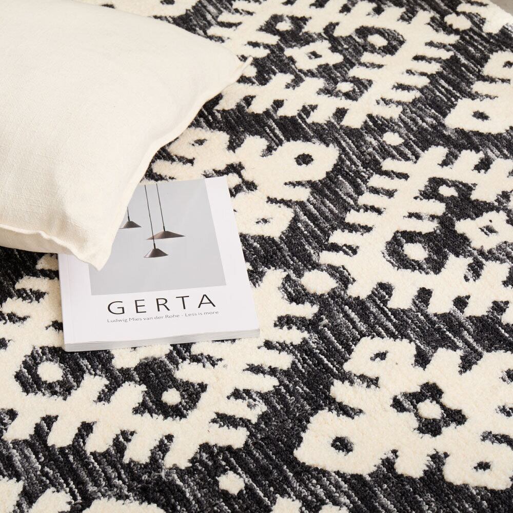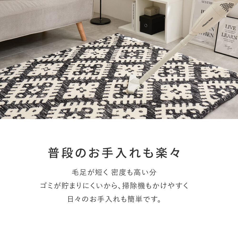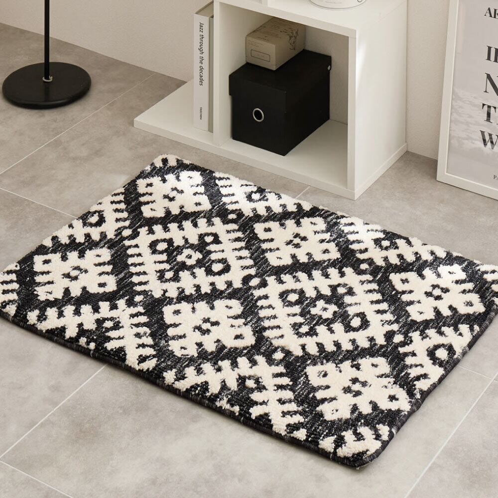 糸を毛羽立たせ柔らかな質感に仕上げたシェニール糸を使い、ジャガード織で繊細な模様を美しく表現した高級感のある一枚。 意外と少ないモノトーンの柄デザインで、 単調になりがちな空間にほどよく個性をプラス!ウレタン入りのふっくらほどよいクッション性で踏み心地が良く、裏面には滑り止め付きでズレにくく安心。掃除機もかけやすく、毛足が短いためゴミが溜まりにくいから日々のお手入れが簡単なのも嬉しいポイントです。