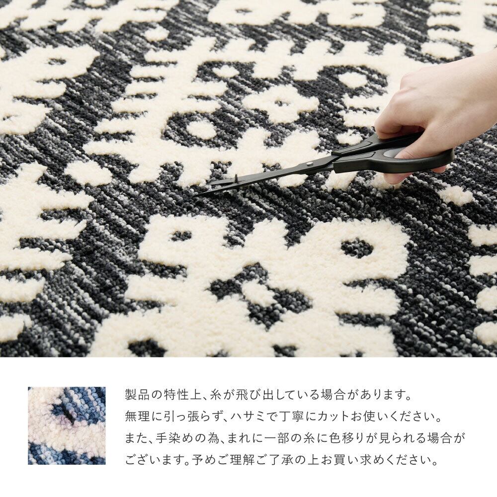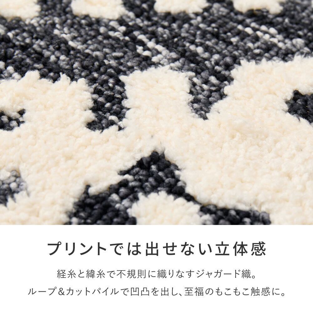 糸を毛羽立たせ柔らかな質感に仕上げたシェニール糸を使い、ジャガード織で繊細な模様を美しく表現した高級感のある一枚。 意外と少ないモノトーンの柄デザインで、 単調になりがちな空間にほどよく個性をプラス!ウレタン入りのふっくらほどよいクッション性で踏み心地が良く、裏面には滑り止め付きでズレにくく安心。掃除機もかけやすく、毛足が短いためゴミが溜まりにくいから日々のお手入れが簡単なのも嬉しいポイントです。