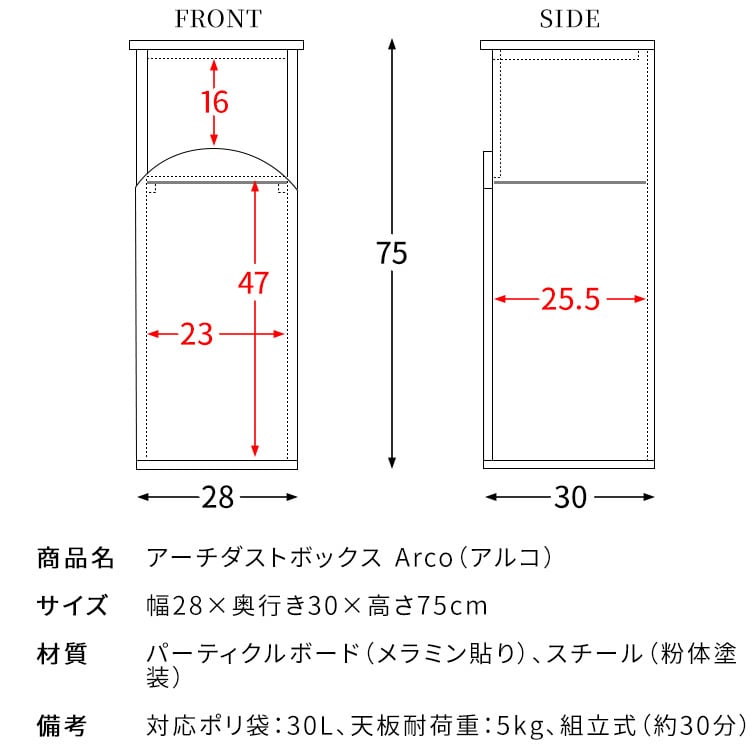 備考 対応ポリ袋:30L、天板耐荷重:5kg、組立式(約30分)