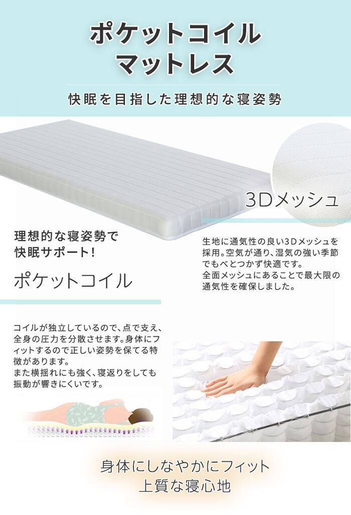 厚み10cmの薄型マットレスが付属します。3Dメッシュで通気性が良く、クッション性も高いポケットコイル仕様です。