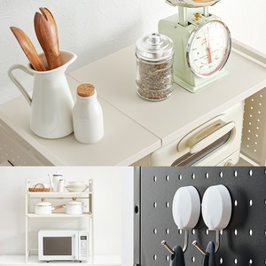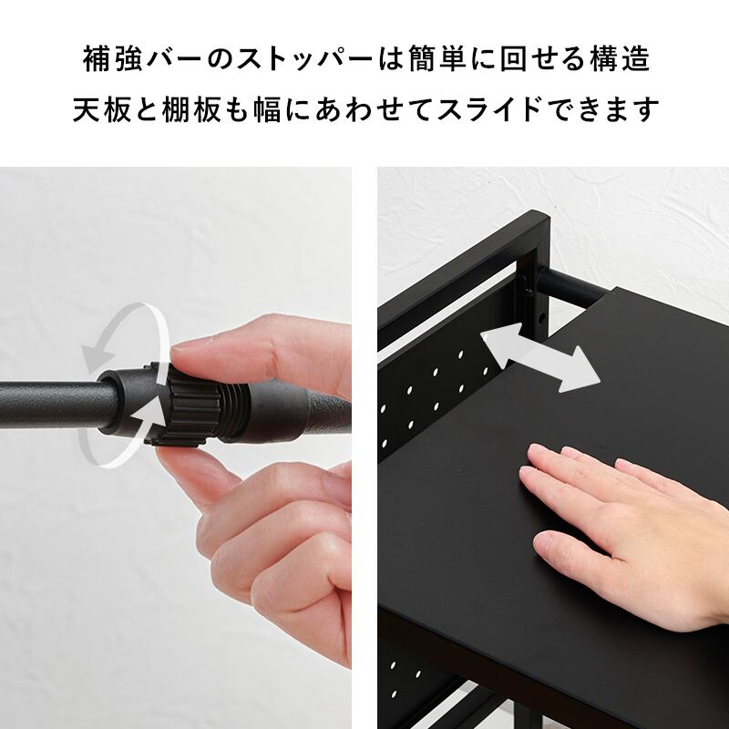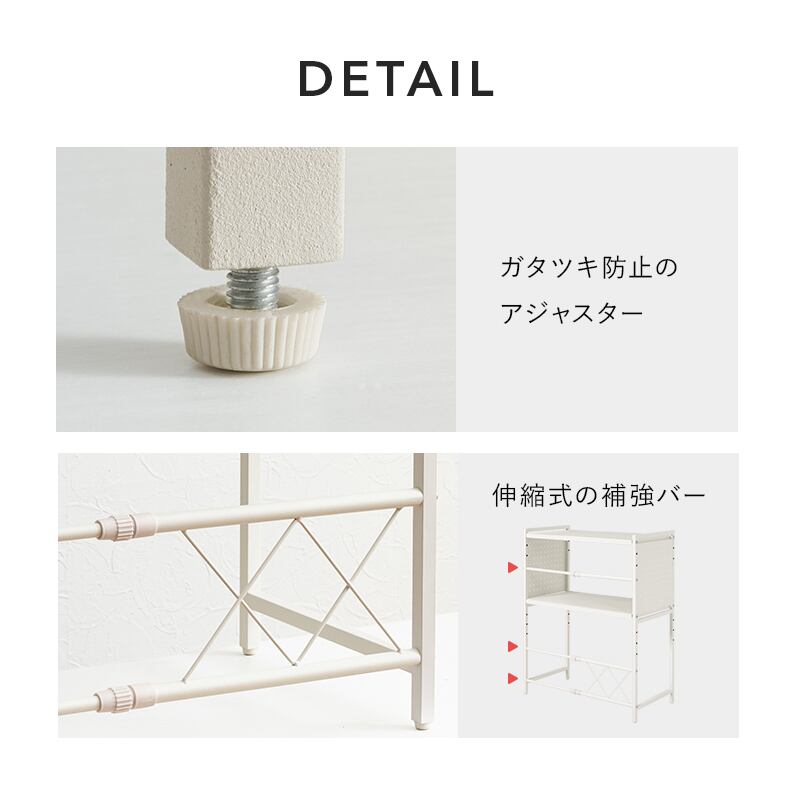 お手持ちの電子レンジや家電に合わせて幅や棚の高さを調節できる伸縮ラック。