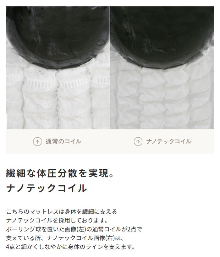 圧倒的なコイル数でしなやかな体圧分散を実現した『ナノテック』は硬めの寝心地です。