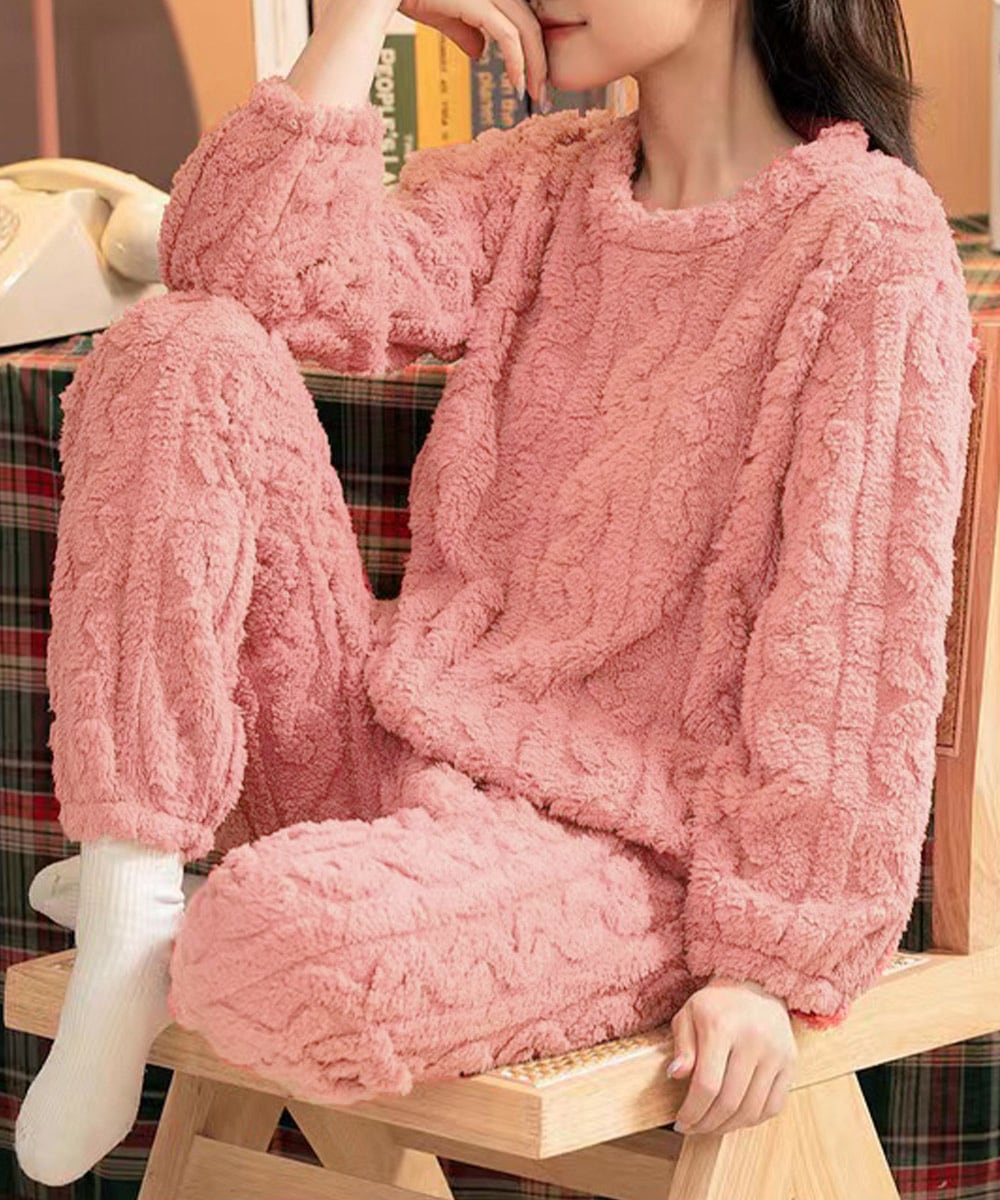 [パジャマセット] フリースパジャマ レディース 上下セット ケーブル柄ルームウェア 秋冬 もこもこ ナイトウェア ふわふわ 韓国 厚手 部屋着 無地 あったか 冬用 防寒