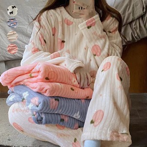 [セットアップ] フリースパジャマ レディース もこもこ 桃柄ルームウェア ふわふわ 可愛い 部屋着 冷え防止 寝巻き 秋冬 ナイトウェア 暖かい 寝間着 長袖厚手 パジャマ柄 韓国風
