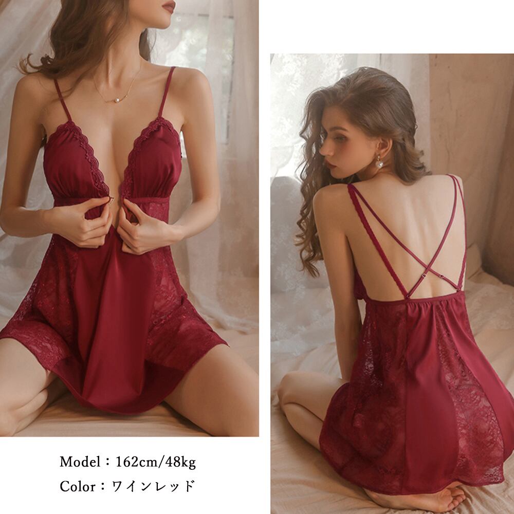 絹のようなサテン生地とレース切り替えがセクシーなキャミワンピースルームウェア
