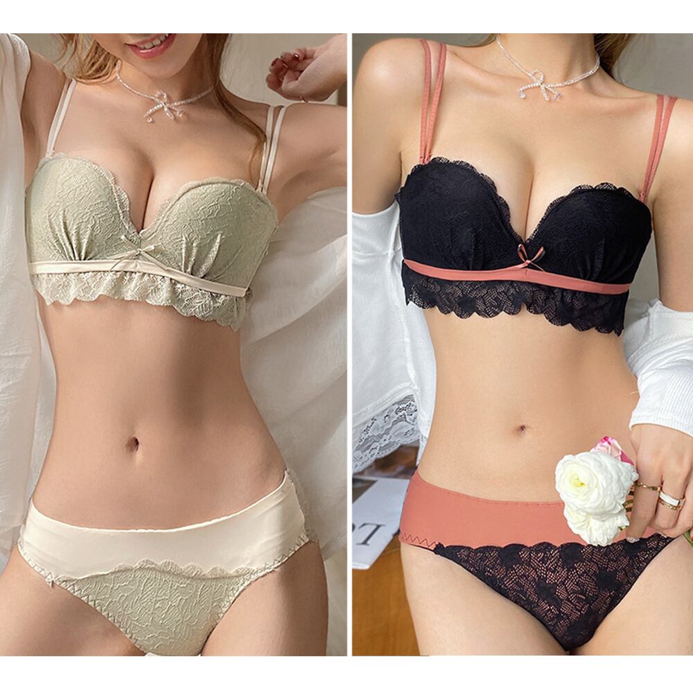 [ブラ&ショーツセット] バイカラーノンワイヤーブラショーツセット セクシーランジェリー 花柄レース レディース 盛れる 美胸ブラジャー 上下セット 大人可愛い ブラセット 透け感 エロい 下着セットインナー 勝負下着脇スッキリ リボンブラエロ下着