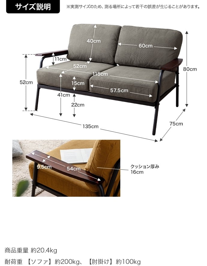 【耐荷重】ソファ:約200kg、肘掛け:約100kg
