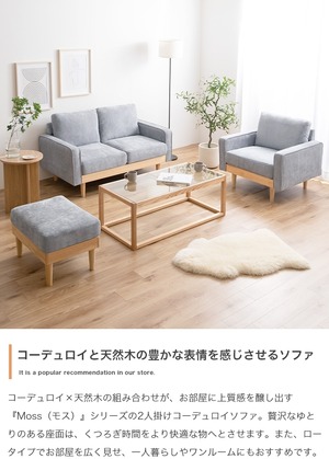 コーデュロイ×天然木の組み合わせが、お部屋に上質感を醸し出す『Moss(モス)』シリーズの2人掛けコーデュロイソファ。贅沢なゆとりのある座面は、くつろぎ時間をより快適なものへとさせます。また、ロータイプでお部屋を広く見せられるので、一人暮らしの方やワンルームにお住まいの方にもおすすめです。