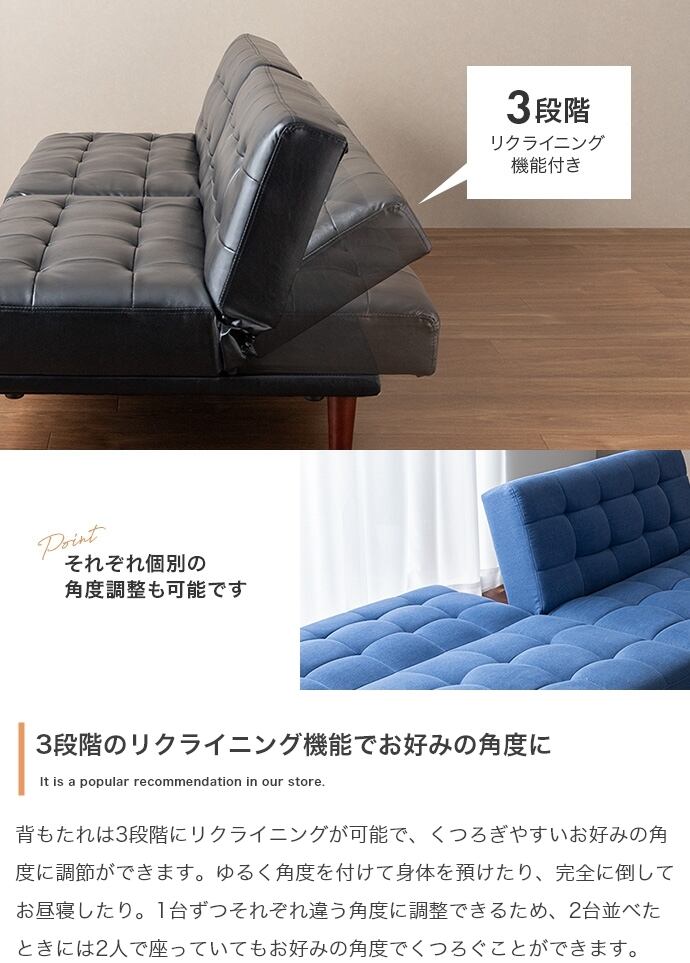 いろんな使い方ができる当店こだわりの多機能ソファベッド『Colton』が登場!2人でゆったり座れるリクライニングソファとして、またベッドとして使えるほか、分割してセパレートすると1人掛けソファとしても来客時に活躍します。脚部は簡単に取り外しできるので、季節やシーンによっていろんなスタイルが楽しめます!またデニム風ファブリック生地とPVCレザー生地にクロスステッチを施した仕上げは、カジュアルでありながら大人っぽい雰囲気を醸し出しています。