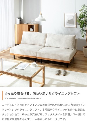 コーデュロイ×木目柄×アイアンの異素材MIXが味わい深い『Ridley(リドリー)』リクライニングソファ。コーデュロイの優しい肌触りと心地よい弾力のクッション、楽な姿勢に調整できる3段階リクライニングで、快適なくつろぎタイムを叶えます。脚も取り外せるロー設計なので圧迫感が少なく、ワンルームなどのスペースに余裕のないお部屋にもピッタリ。また、2脚揃えるとソファベッドになり、友人や家族が泊まりに来た時用の簡易ベッドや、足をのばしてくつろぐカウチソファとしても大活躍します。
