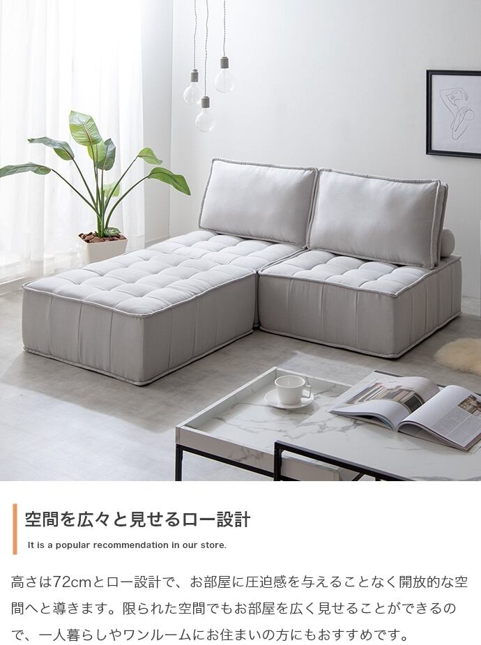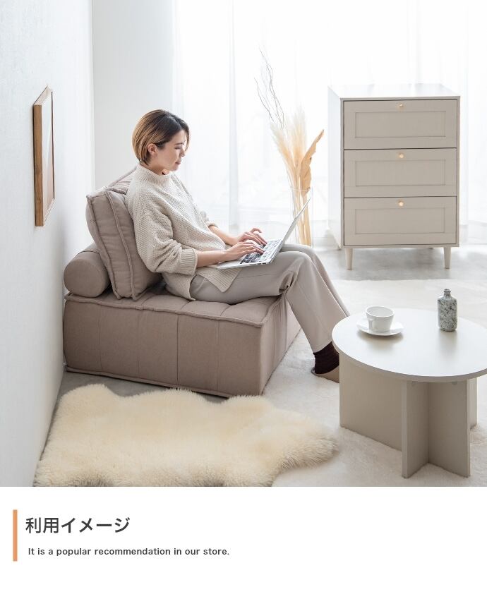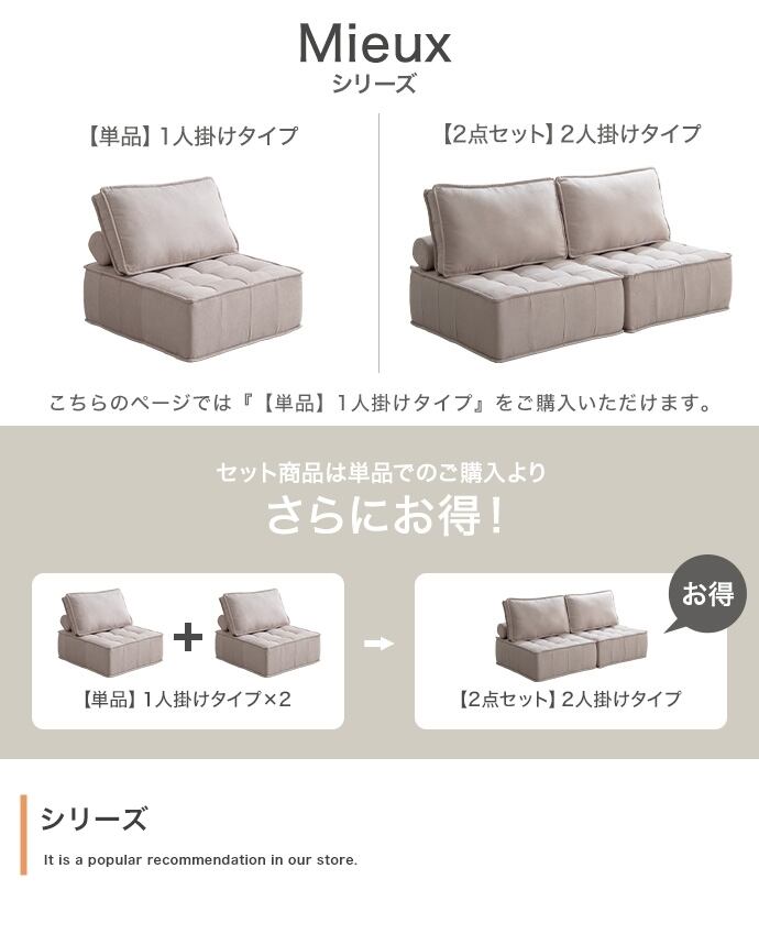 まるで海外インテリアのような上質で感度の高い空間を演出できる『Mieux(ミュー)』1人掛けローソファ。セパレート式でお部屋の間取りなどに合わせて気軽に組み替えていただけます。また、背もたれはもたれてもずれ落ちない仕様で、快適な使い心地です。さらに、ロータイプながらも座面は高めの設計。ポケットコイルも入っているので、底付き感がなく座り心地も抜群です。
