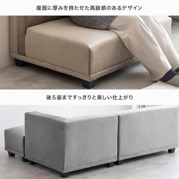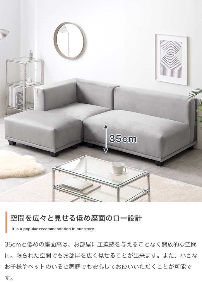 高級感のあるベロア素材を使用した『Celina(セリーナ)』シリーズ。お部屋の間取りやシーンに合わせ自由自在に組み換えが可能です。また、低め座面のロー設計で、お部屋を広く見せる効果があり、空間を贅沢にお使いいただけます。