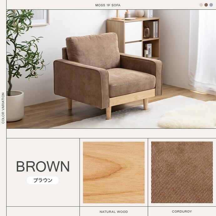 コーデュロイ×天然木の組み合わせが、お部屋に上質感を醸し出す『Moss(モス)』シリーズの1人掛けコーデュロイソファ。贅沢なゆとりのある座面は、くつろぎ時間をより快適な物へとさせます。また、ロータイプでお部屋を広く見せられるので、一人暮らしの方やワンルームにお住まいの方にもおすすめです。