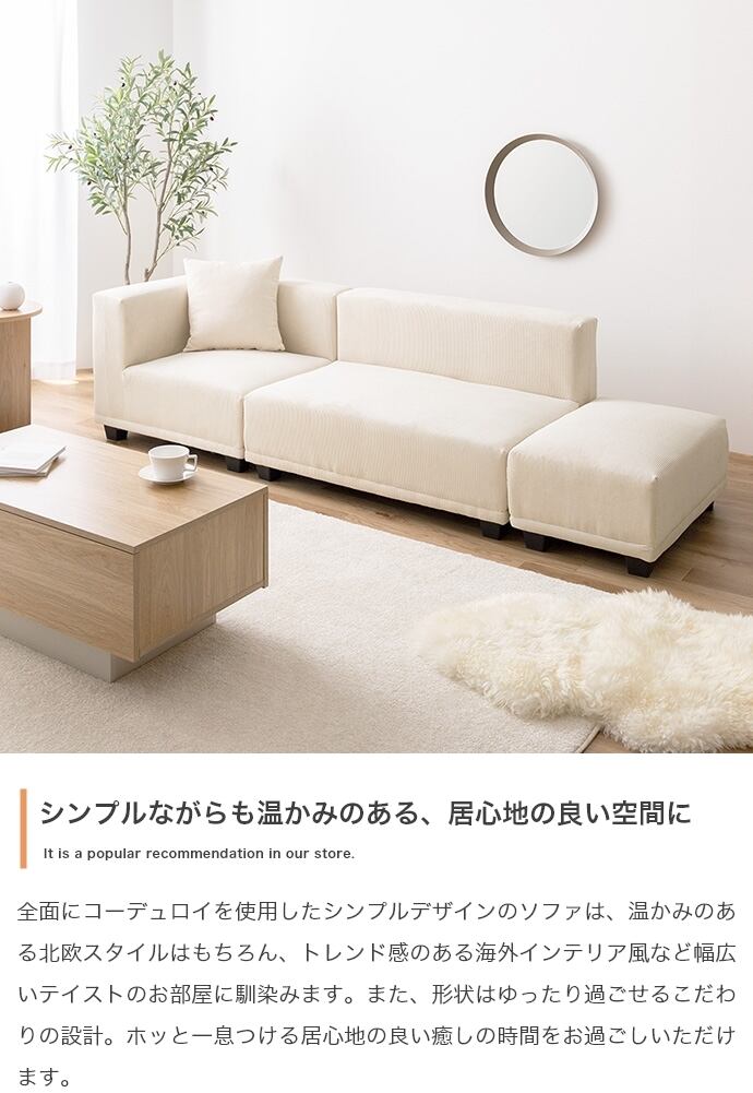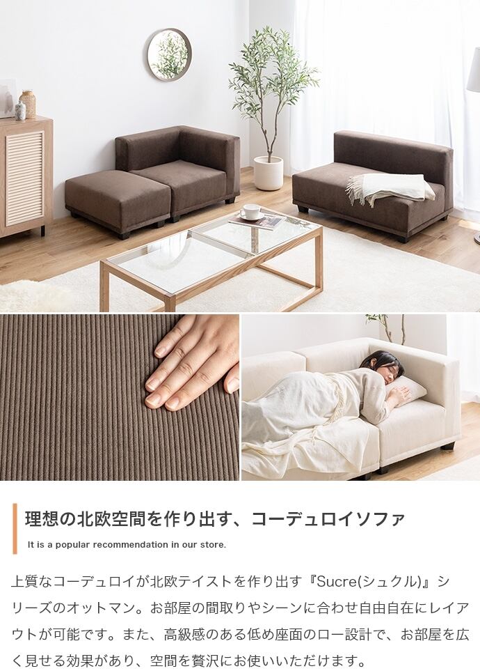 上質なコーデュロイが理想の北欧テイストを作り出す『Sucre(シュクル)』シリーズのオットマン。全面にコーデュロイを使用したシンプルデザインのソファは、温かみのある北欧スタイルはもちろん、トレンド感のある海外インテリア風など、幅広いテイストのお部屋に馴染みます。また、シリーズで揃えるとお部屋の間取りやシーンに合わせ自由自在にレイアウトが可能です。高級感のある低め座面のロー設計で、お部屋を広く見せる効果があり、空間を贅沢にお使いいただけます。