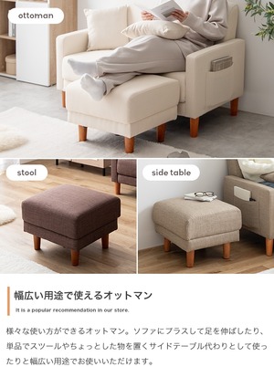 ファブリックと天然木の組み合わせが温かみのある印象を与える『Emma(エマ)』コンパクトオットマン。コンパクトながらも深く腰掛けられるゆったりとしたサイズ設計で、くつろぎ時間をより快適なものへと導きます。北欧デザインが可愛いだけでなく、左右両サイドのひじ掛け部分に座ったまま手が届くポケットが付いていて、とっても機能的。また、ロータイプでお部屋を広く見せられるため、ひとり暮らしやワンルームにもおすすめです。