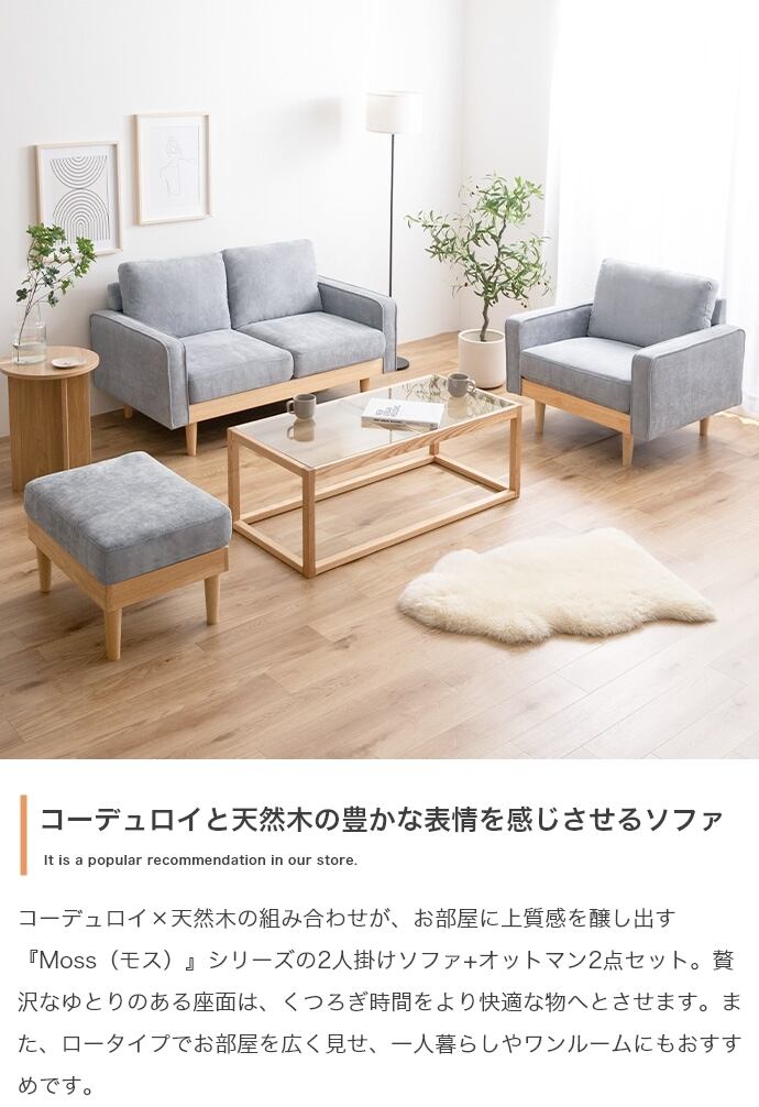 コーデュロイ×天然木の組み合わせが、お部屋に上質感を醸し出す『Moss(モス)』シリーズの2人掛けコーデュロイソファ1脚+オットマン1脚の2点セット。贅沢なゆとりのある座面は、くつろぎ時間をより快適なものへとさせます。また、ロータイプでお部屋を広く見せられるので、一人暮らしの方やワンルームにお住まいの方にもおすすめです。