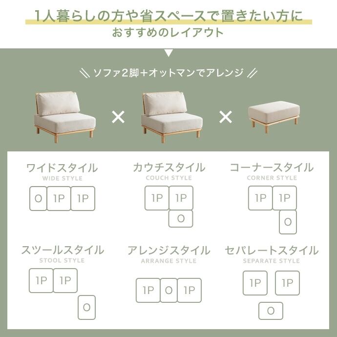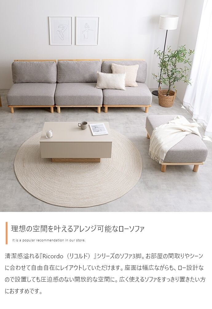 自分好みの形に自由にレイアウトできる『Ricordo(リコルド)』シリーズ。ユニットタイプなので、お部屋の間取りやシーンに合わせて様々な配置が可能です。また、天然木をふんだんに使用したフレームと優しいファブリック生地の組み合わせがお部屋に清潔感と明るさをもたらし、居心地のいい空間を演出します。さらに、幅広の座面にはポケットコイルを使用。程よく弾力性があり、長時間座っていても疲れにくいので、ゆったり快適にお寛ぎいただけます。