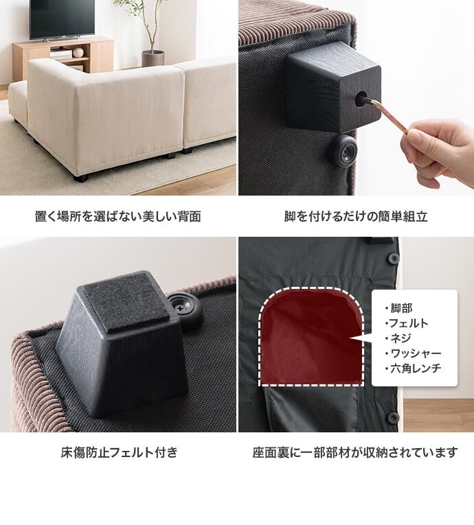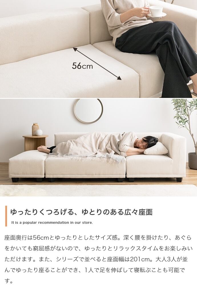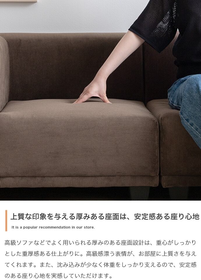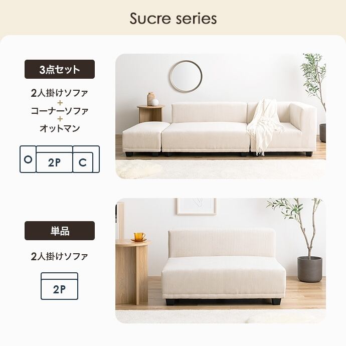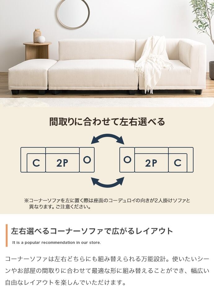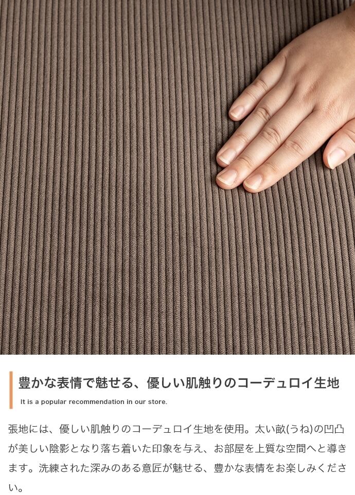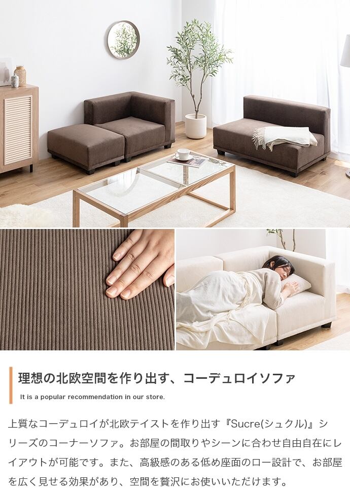 上質なコーデュロイが理想の北欧テイストを作り出す『Sucre(シュクル)』シリーズのコーナーソファ。全面にコーデュロイを使用したシンプルデザインのソファは、温かみのある北欧スタイルはもちろん、トレンド感のある海外インテリア風など、幅広いテイストのお部屋に馴染みます。また、シリーズで揃えるとお部屋の間取りやシーンに合わせ自由自在にレイアウトが可能です。高級感のある低め座面のロー設計で、お部屋を広く見せる効果があり、空間を贅沢にお使いいただけます。