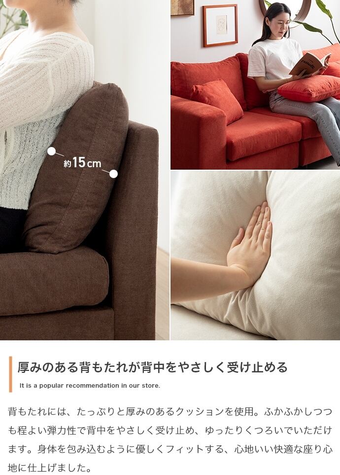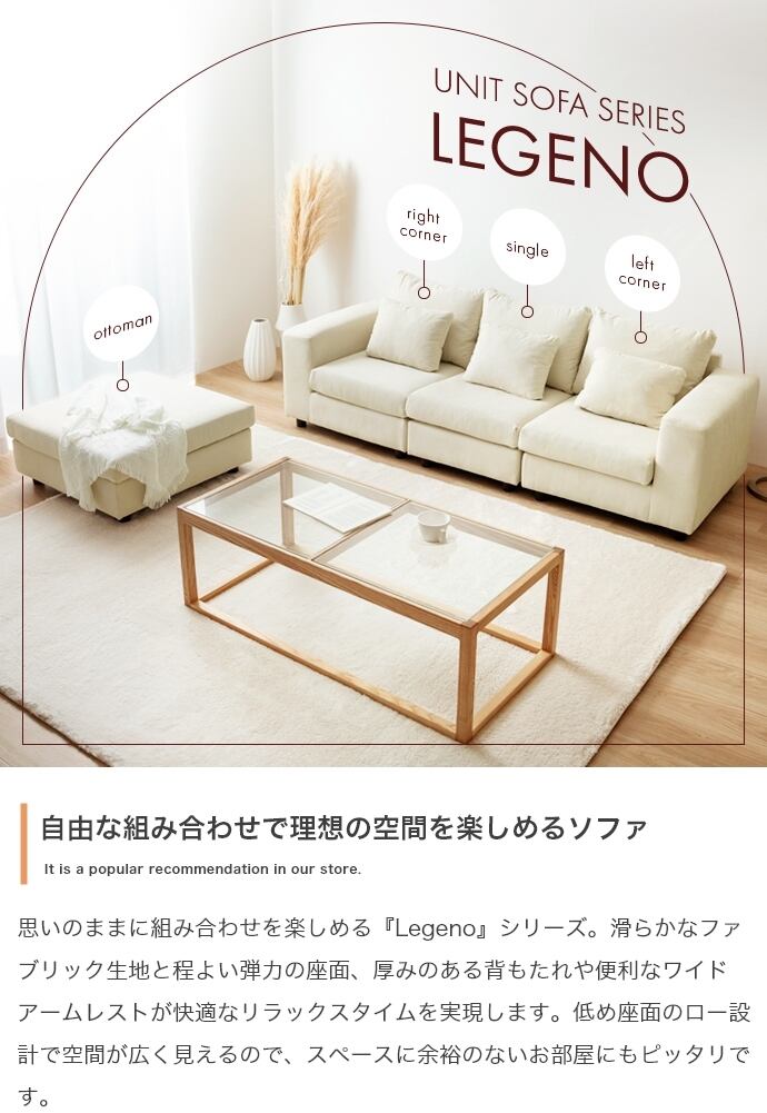理想の空間を自由に楽しめる『Legeno(レゲノ)』シリーズ。お部屋の間取りやシーンに合わせて自由自在な組み替えが可能。滑らかなファブリック生地とふかふかの座面、厚みのある背もたれや便利なワイドアームレストが快適なリラックスタイムを実現します。ロータイプでお部屋を広く見せられるので、一人暮らしの方やワンルームにお住まいの方にもおすすめです。