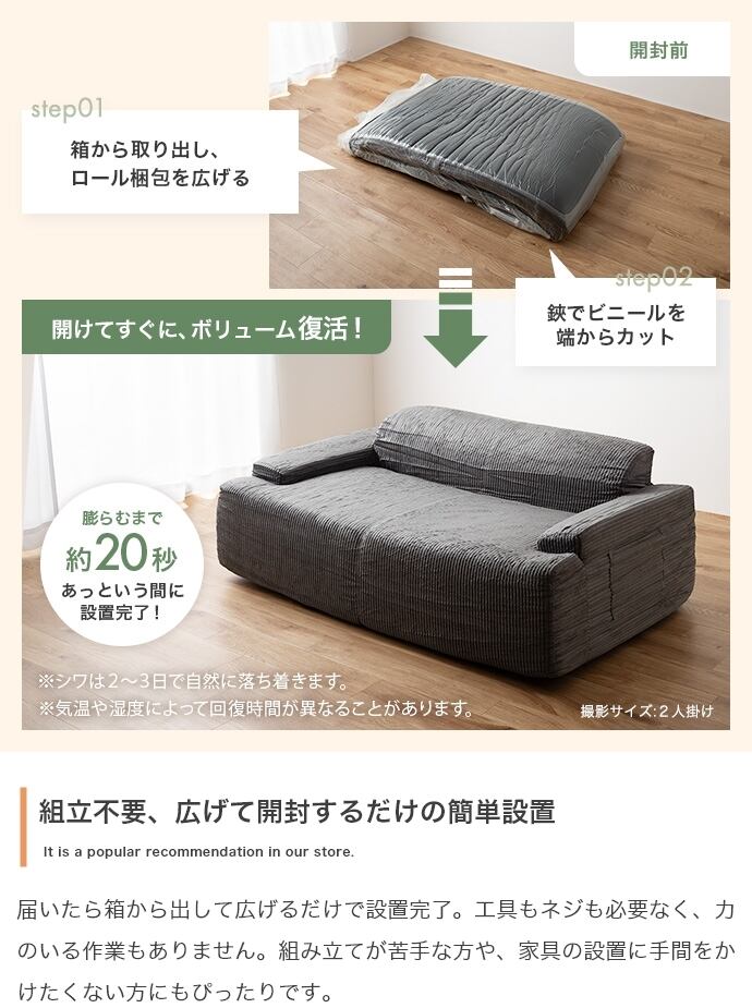 小さく届いて広々使える、快適圧縮ソファ『Parrot(パロット)』シリーズの2人掛けソファ。圧縮梱包でお届けするため、狭い玄関や通路でもスムーズに搬入可能。広げるだけで設置が完了し、工具やネジは不要。力のいる作業もありません。高密度ウレタンをたっぷり使用し、広めの座面としっかりした弾力で、ゆったりくつろげる座り心地を実現しました。両側には小物の収納に便利なポケット付きで、リモコンや雑誌などをさっと片付けできます。