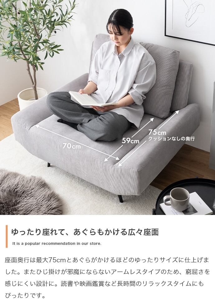 贅沢なリラックス時間を叶える一人掛けソファ。スペースが限られた空間にも置きやすいサイズ感ながら、座面はあぐらがかけるほどのゆったり設計に。読書や映画鑑賞など長時間のリラックスタイムにもぴったりで、自分だけの贅沢なひとときを楽しめます。さらに素材には手ざわりのよいコーデュロイ生地を使用。やさしい質感と落ち着いた色合いが、洗練された空間を演出します。