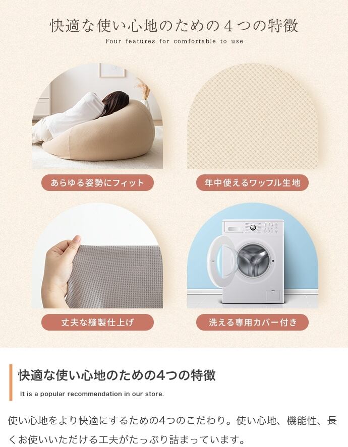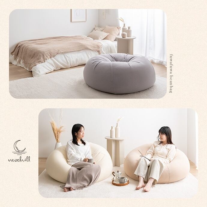 毎日のリラクゼーションタイムを、より心地よい安らぎの時間に変える『Neochill(ネオチル)』シリーズの、fuwafuwa ビーズクッション。自由自在に変形するので、シーンや気分に合わせてお好きな形で使うことが可能です。さらに、極小ビーズがあらゆる体勢や体形に優しくフィット。包み込まれるような極上のくつろぎ時間をお過ごしいただけます。また、付属の専用クッションカバーは当店オリジナルのくすみカラーを使用。インテリアに馴染みやすく、ご家庭での洗濯も可能なので、いつでも衛生的にお使いいただけます。