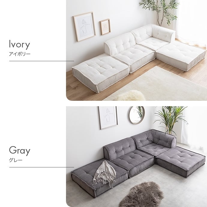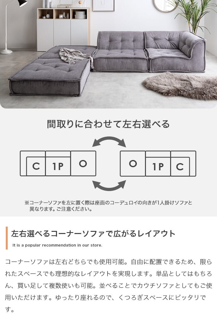 上質なコーデュロイ生地が美しい『Chouchou(シュシュ)』シリーズのフロアソファ。全面にコーデュロイを使用したデザインは、北欧スタイルはもちろんトレンド感のある海外インテリア風など、幅広いテイストのお部屋に馴染みます。また、2種類のソファとクッションはそれぞれ独立して使用可能。お部屋の間取りやシーンに合わせて自由自在にレイアウトが可能です。低め座面のロー設計で、お部屋を広く見せる効果があり、空間を贅沢にお使いいただけます。