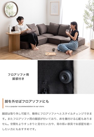シンプルで洗練された印象の『Cindy(シンディ)』シリーズのカウチソファ。お部屋の間取りやライフスタイルの変化に合わせて、自由自在なレイアウトがお楽しみいただけます。座り心地のいい座面や空間を広く見せるロー設計、脚を取り外せばフロアソファとしても使える2WAY仕様など、こだわりをたっぷり詰め込みました。