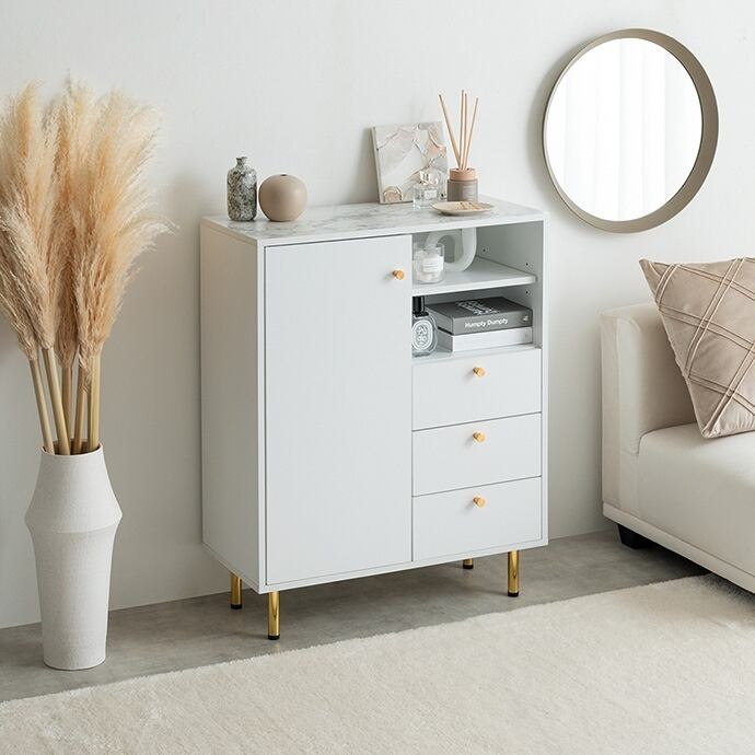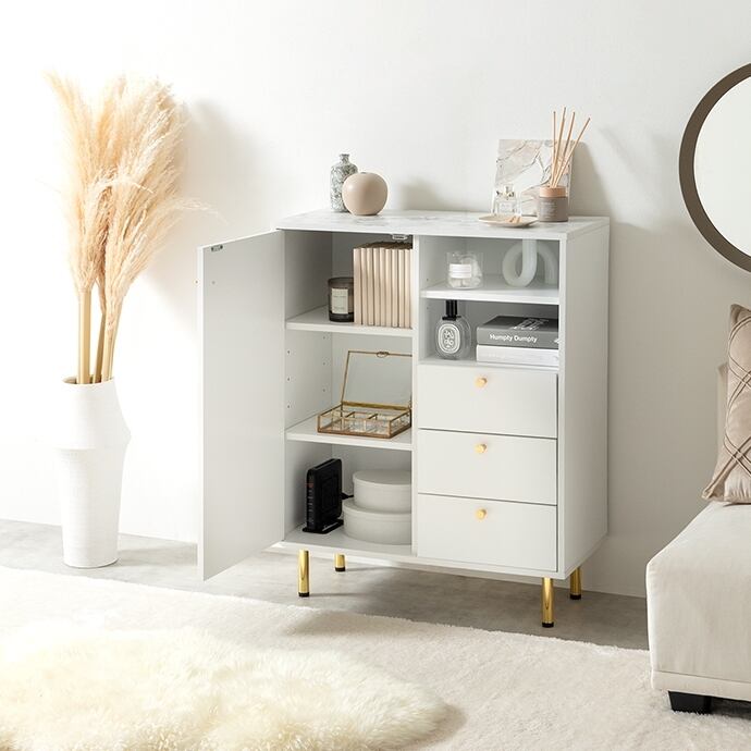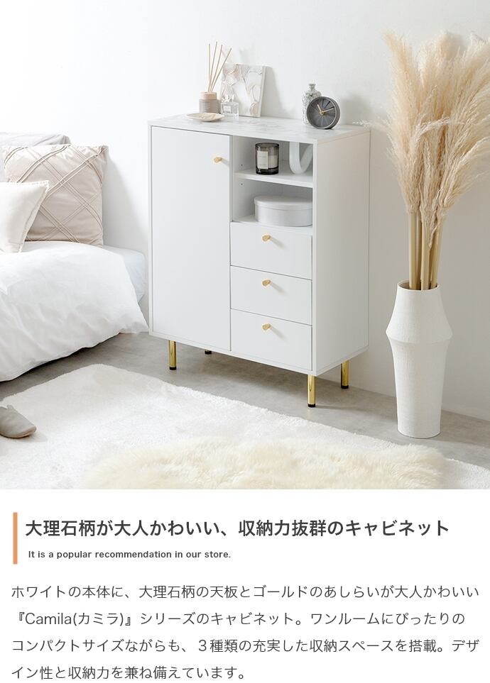 天板の大理石柄とゴールドのあしらいが特徴の『Camila(カミラ)』シリーズのキャビネット。大人かわいいデザインの本体とスタイリッシュなゴールド脚付きで、置くだけでお部屋の雰囲気を高めてくれます。3つの収納スペースと背面のケーブル穴で、ごちゃつきがちな雑貨や雑誌・LANケーブル類などもスマートに整理でき、生活感がなく美しい空間を実現可能。幅70cmとコンパクトサイズなので、一人暮らしやワンルームなど限られたスペースにもすっきり置いていただけます。