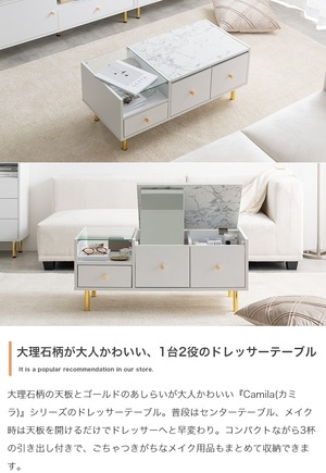 天板の大理石柄とゴールドのあしらいが特徴の『Camila(カミラ)』シリーズのドレッサーテーブル。普段はセンターテーブル、天板を開けるとドレッサーになる1台2役の省スペースなサイズ感は、1人暮らしやワンルームにもぴったりです。深さの異なる3つの引き出しと、ガラスの美しいディスプレイ収納付きで、ごちゃつきがちなメイク用品もスマートに整理できます。