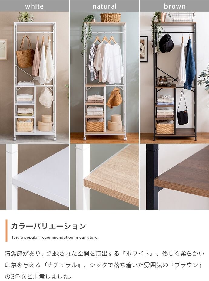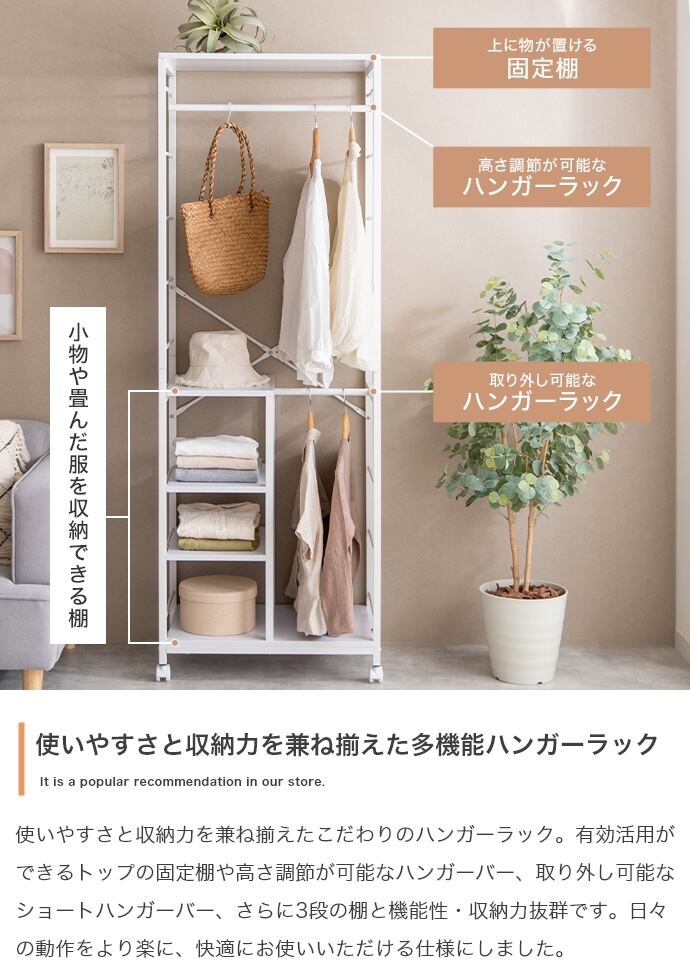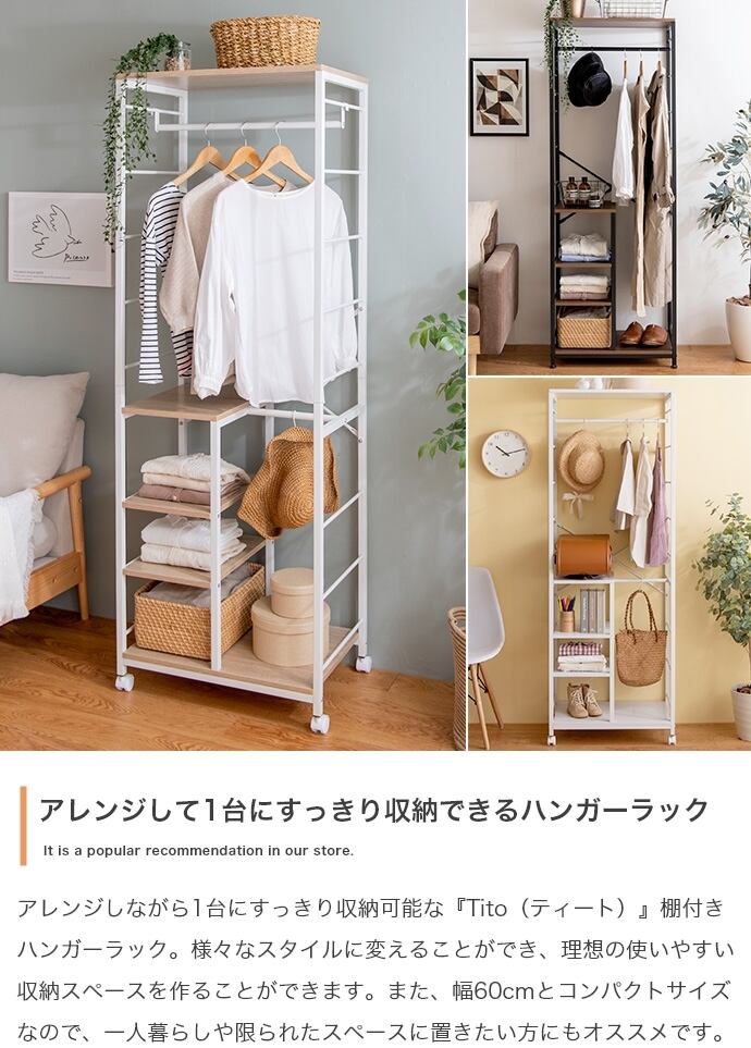 理想のスタイルを叶えつつ、1台にまとめて収納できる多機能な『Tito(ティート)』シリーズの棚付きハンガーラック。様々なスタイルに変えられ、自分好みの収納空間を作ることが可能です。ハンガーバーは高さ変更可能なので、取りやすい高さに調節することができます。また、取り外し可能なショートハンガーバーも付いており、外して使うことでロングコートをかけることも可能。さらに、棚付きなので、帽子や靴下などの細々したものまで収納できます。1台にまとめらて、省スペースで置いていただけるので、一人暮らしの方にもおすすめです。