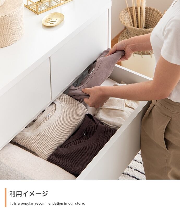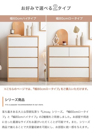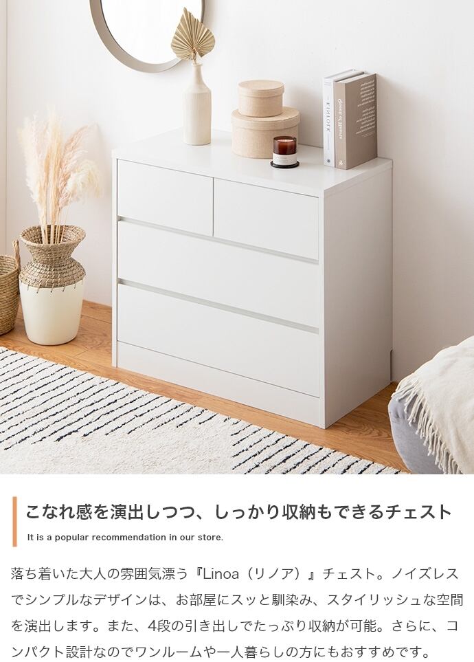 落ち着いた印象を与えながらお部屋にスッと馴染む『Linoa(リノア)』シリーズのロータイプチェスト。ノイズレスでシンプルなデザインは、お部屋にすっきりとした印象を与え、スタイリッシュで洗練された空間を演出します。サイズは省スペースで置けるコンパクト設計なので、一人暮らしの方やワンルームにお住まいの方も置いていただきやすいです。また、コンパクトなのに収納力も抜群。引き出しの深さもしっかりあるので、厚手の物や高さのある物もしっかり収納できます。オールシーズンの衣類をまとめて収納しておきたい方にもオススメです。