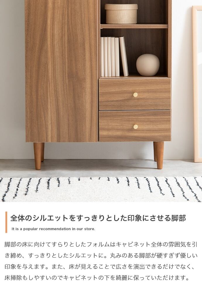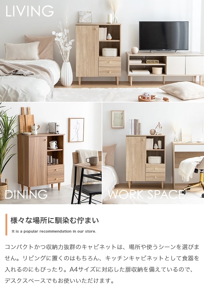 コンパクトさと収納力を両立した『Lucas(リュカ)』シリーズの脚付きキャビネット。用途やサイズごとに仕分けができる3種類の収納エリアを設け、本や書類、小物なども纏めて収納できます。扉収納にはコード穴が開いているので、Wi-Fiルーターなどの収納にもピッタリ。一人暮らしにお勧めのコンパクトサイズで、置き場所を取りません。リビングやキッチン、デスクスペースなど様々な場所でお使いいただけます。