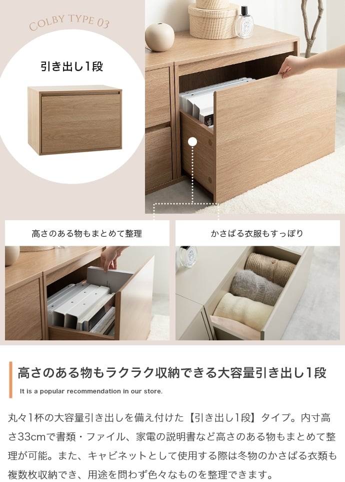 思い通りの収納スタイルに変幻自在な組み合わせテレビ台『Colby』シリーズの引き出し2段タイプ。単品使いでも便利な選べる3タイプで、テレビ台だけでなく、キャビネットやサイドテーブルなど、組み合わせによって様々な収納家具にカスタムできます。コンパクトながら大容量の収納力で、散らかりがちな小物をまとめて整理可能です。
