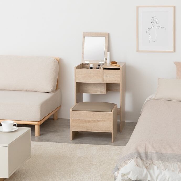 コンパクトでベーシックデザインが特徴的な『Qure』コンパクトドレッサー。幅50cmと場所を取らない省スペース設計ながら、3か所に収納場所を設けたこだわりの品です。メイクやヘアセットに必要な化粧品や美容家電をまとめて収納することで、毎日の身支度が快適に、楽しくなるドレッサー。収納力抜群で、一人暮らしやワンルームにもピッタリです。