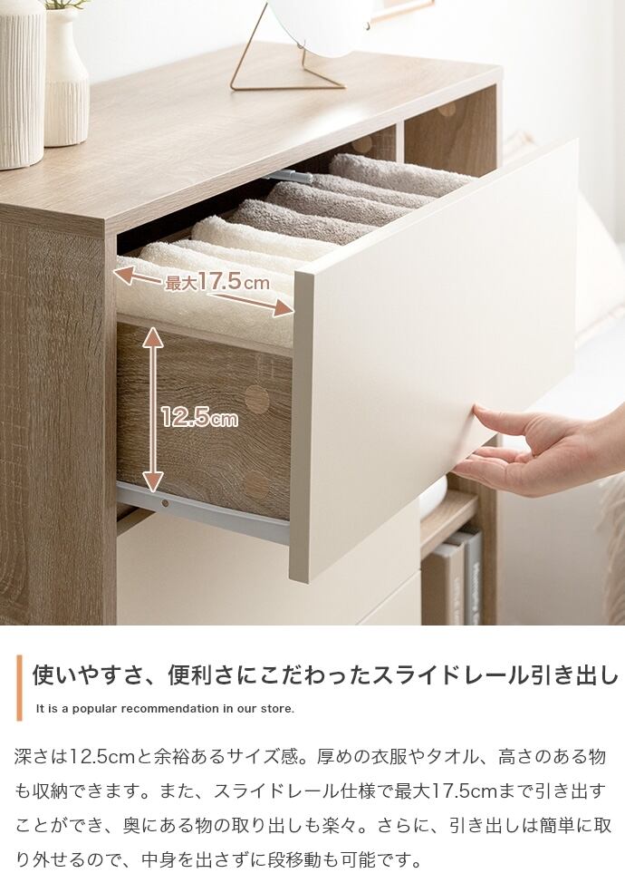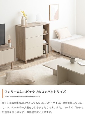 美しい木目調×アイボリーのバイカラーが特徴の『Erin(エリン)』シリーズのバイカラー棚付きチェスト。天然木のような木目柄とアイボリーの組み合わせが、ナチュラルでありながらモダンな印象を与えてくれます。また、ワンルームにぴったりのコンパクトサイズでありながらも、充実した収納スペース。デザイン性と実用面を兼ね備えています。