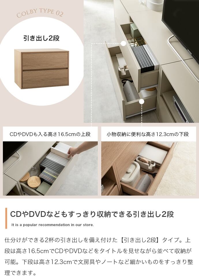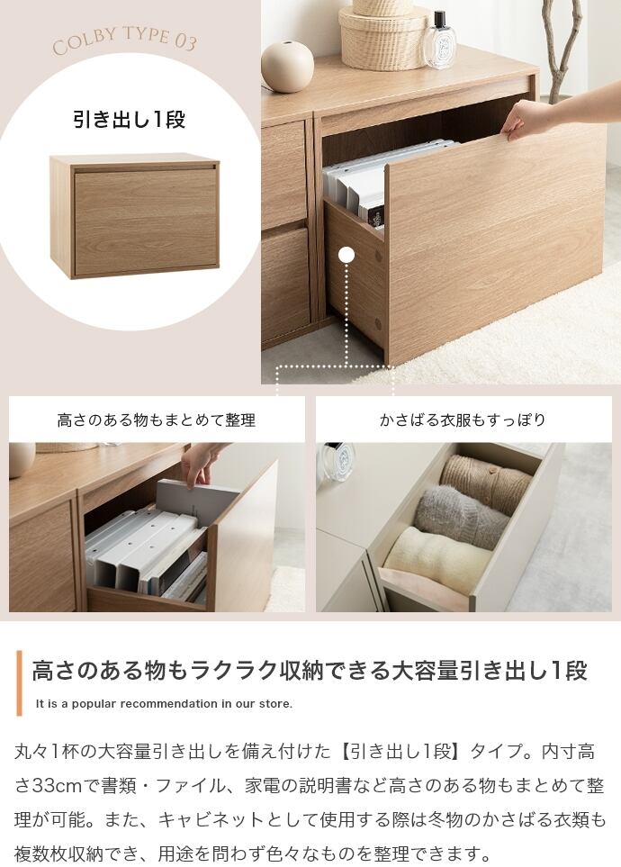 思い通りの収納スタイルに変幻自在な組み合わせテレビ台『Colby』シリーズの引き出し1段タイプ。単品使いでも便利な選べる3タイプで、テレビ台だけでなく、キャビネットやサイドテーブルなど、組み合わせによって様々な収納家具にカスタムできます。コンパクトながら大容量の収納力で、散らかりがちな小物をまとめて整理可能です。