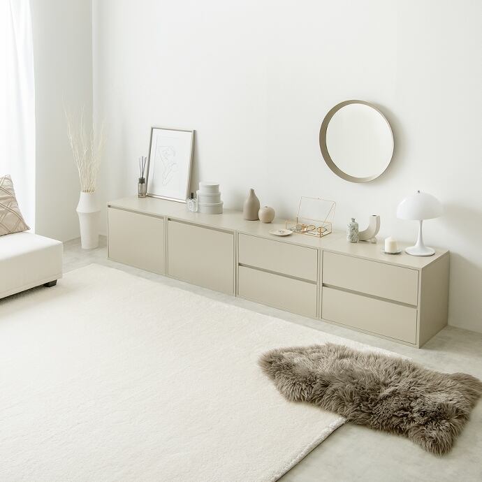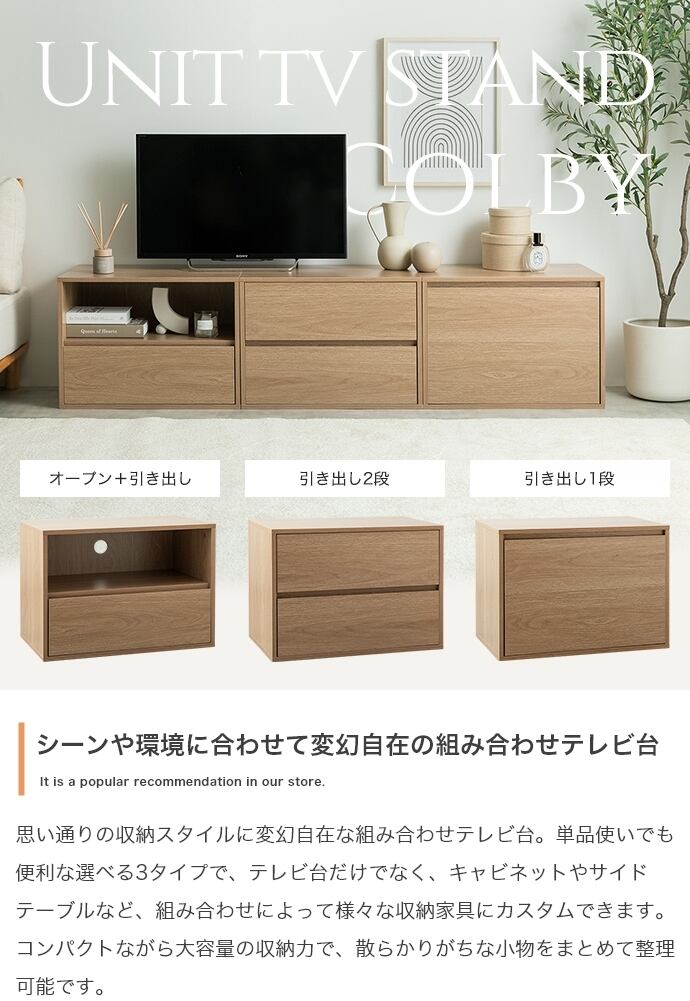 思い通りの収納スタイルに変幻自在な組み合わせテレビ台『Colby』シリーズの単品オープン+引き出しタイプ。単品使いでも便利な選べる3タイプで、テレビ台だけでなく、キャビネットやサイドテーブルなど、組み合わせによって様々な収納家具にカスタムできます。コンパクトながら大容量の収納力で、散らかりがちな小物をまとめて整理可能です。