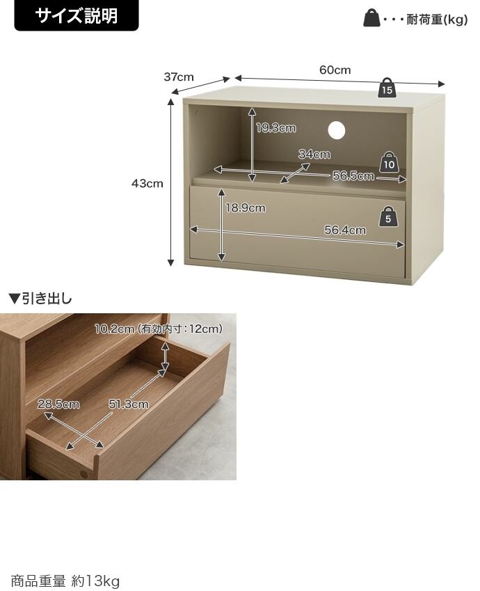 【耐荷重】天板:約15kg 、オープン収納:約10kg、引き出し:約5kg