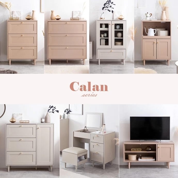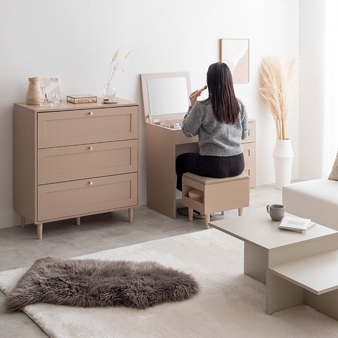 品のある框(かまち)デザインと柔らかなニュアンスカラーが印象的な『Calan』シリーズのドレッサーデスク。シャンパンゴールドの取っ手と美しい框デザインがお部屋のアクセントとなり、感度の高い海外インテリアのような空間へと導きます。さらに柔らかなニュアンスカラーで甘すぎない大人な可愛さもプラスしました。また2WAY仕様でドレッサーとしても、デスクとしてもお使いいただくことが可能です。収納力も抜群でオープン収納や引き出し収納、スツール収納と支度に必要な物をこの1台にまとめておけます。