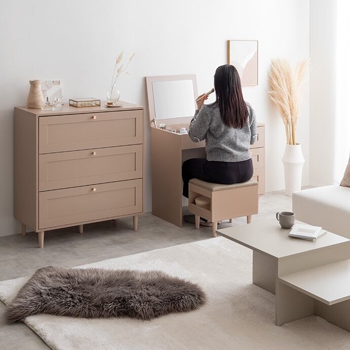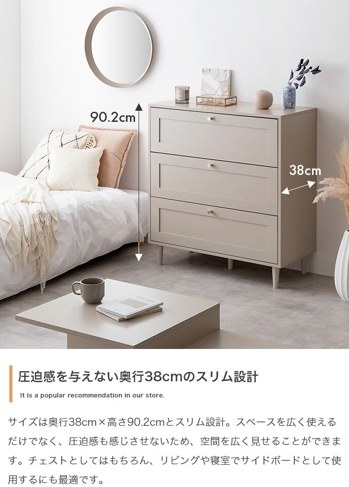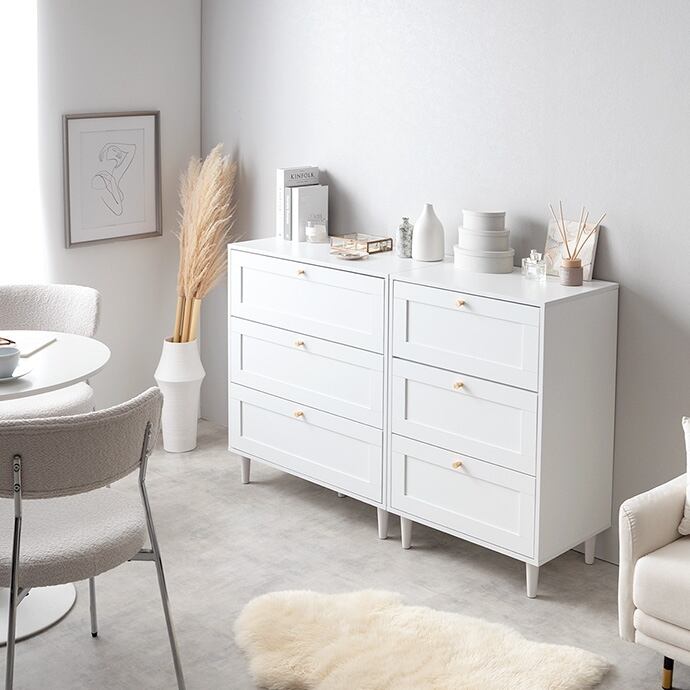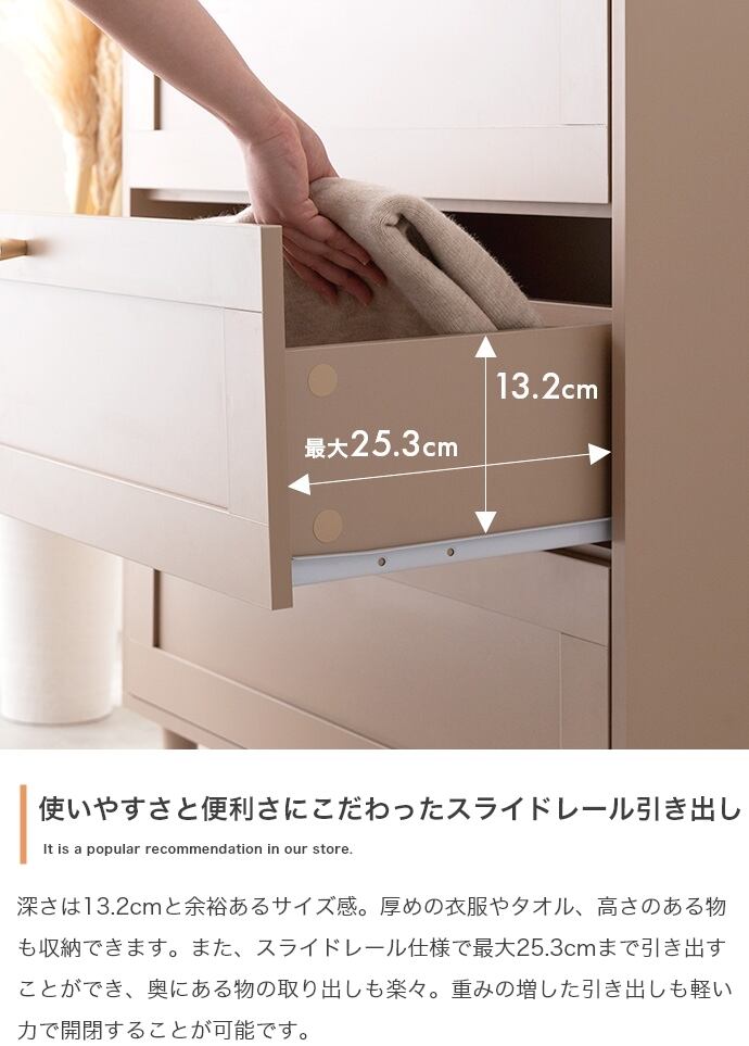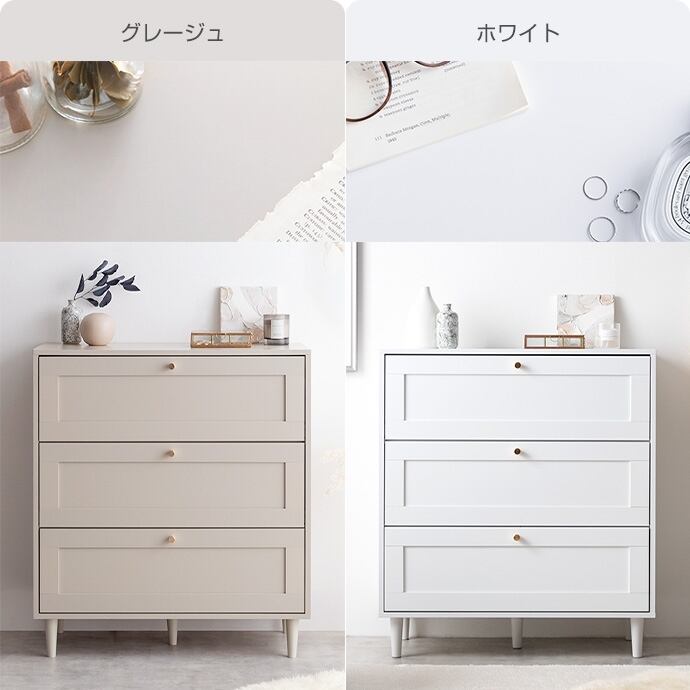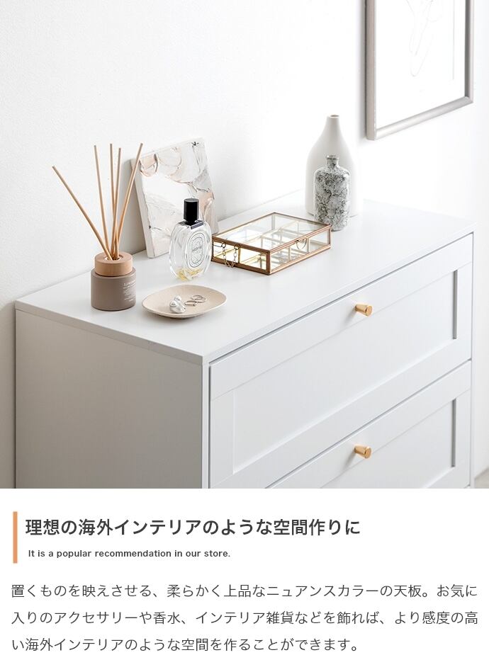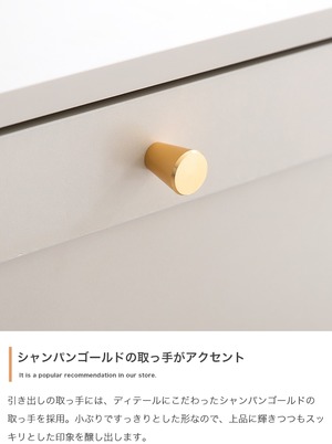品のある框デザインと柔らかなニュアンスカラーが印象的な『Calan』シリーズのチェスト。シャンパンゴールドの取っ手と美しい框デザインがお部屋のアクセントとなり、感度の高い海外インテリアのような空間へと導きます。柔らかなニュアンスカラーで甘すぎない大人な可愛さもプラスし置くだけでお部屋をセンスアップさせます。また収納力も抜群で引き出しの深さもしっかりあるので、厚手の物や高さのある物もしっかり収納できます。オールシーズンの衣類をまとめて収納しておきたい方にもオススメです。