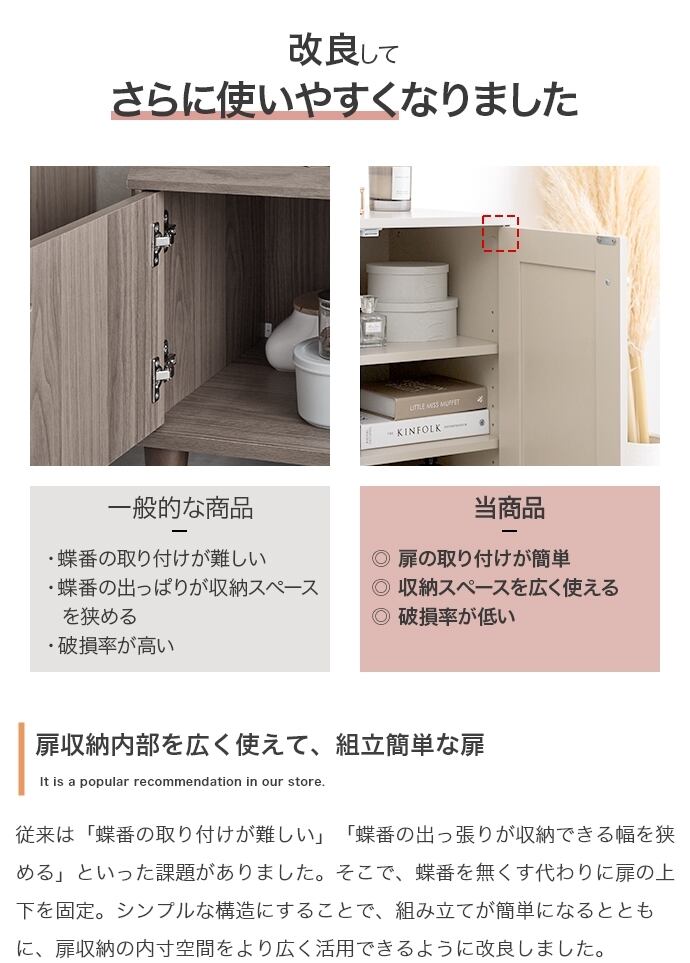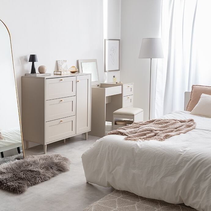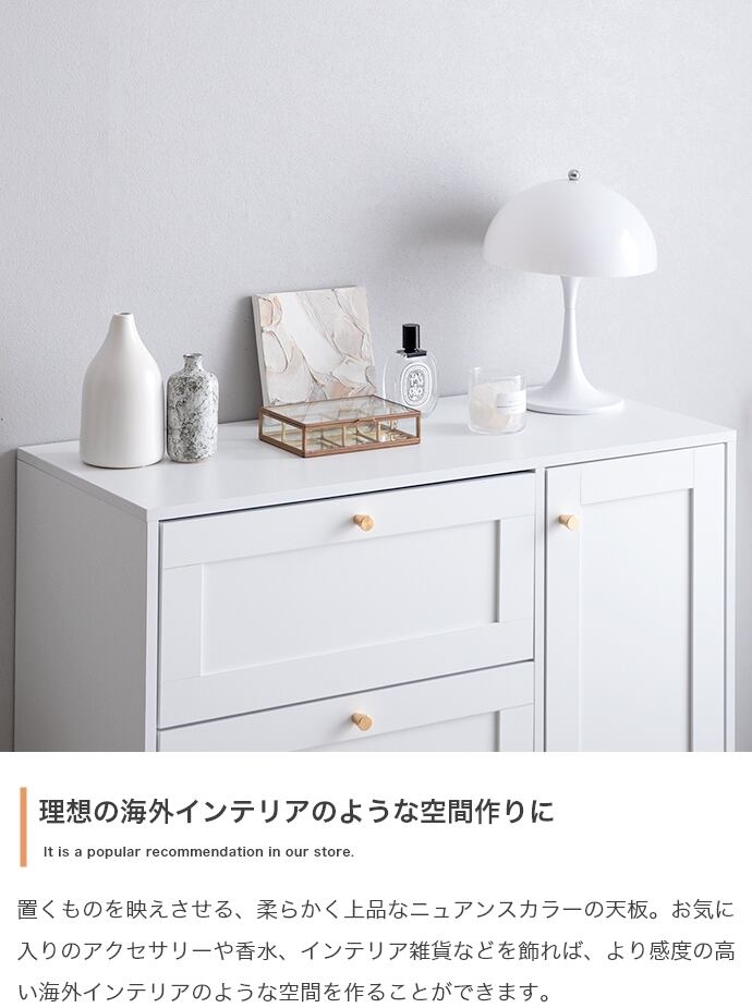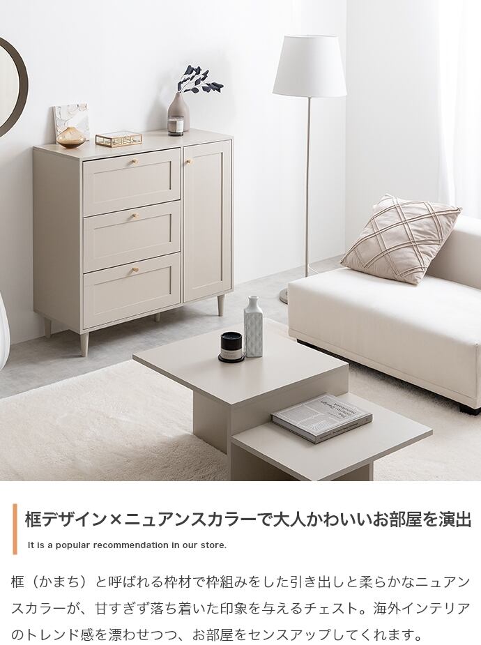 品のある框(かまち)デザインと柔らかなニュアンスカラーが印象的な『Calan(カラン)』シリーズのキャビネット。シャンパンゴールドの取っ手と美しい框デザインがお部屋のアクセントとなり、感度の高い海外インテリアのような空間へと導きます。柔らかなニュアンスカラーで甘すぎない大人な可愛さもプラスし、置くだけでお部屋をセンスアップさせることが可能です。