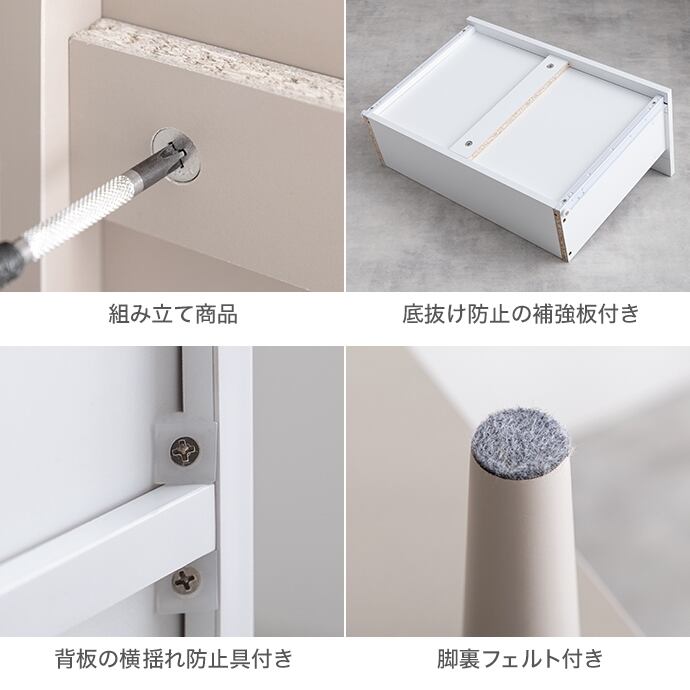【耐荷重】天板:約15kg、引き出し:約5kg、扉収納底板:約6kg、可動棚:約5kg